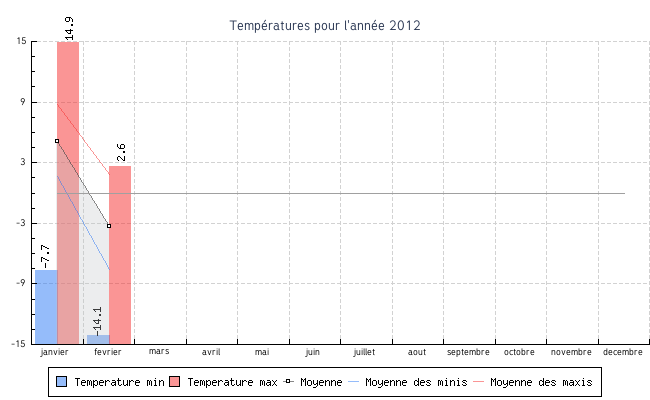 | fevrier | -14.1 °C | -7.6 °C | 2.6 °C | 1.8 °C | -3.3 °C | 4.4 km/h | 24.8 km/h | E |